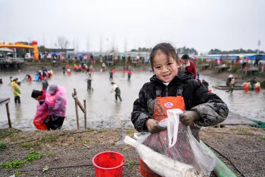 只见,塘中泥点飞舞,有人屏息凝神,双手在塘中认真摸索,突然眼睛一亮,猛地一抓,一条滑溜溜的大鱼便在怀中奋力摆尾,溅得一身泥水,引来阵阵喝彩。有人全家齐心协力,包抄堵截,笑闹声此起彼伏,原本平静的泥塘瞬间变成了一片欢乐的海洋。
