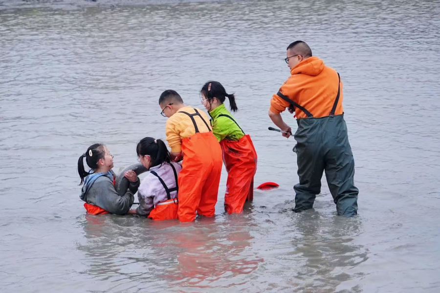 活动当天上午,随着一阵喧天的锣鼓正式拉开摸鱼大战的序幕。报名参与的亲子家庭在工作人员引导下,有序完成实名核销,领取专用摸鱼装备,迫不及待地踏入塘中,感受泥浆在脚下的奇妙触感,大人孩子瞬间卸下所有拘谨,化身为“捕鱼达人”。