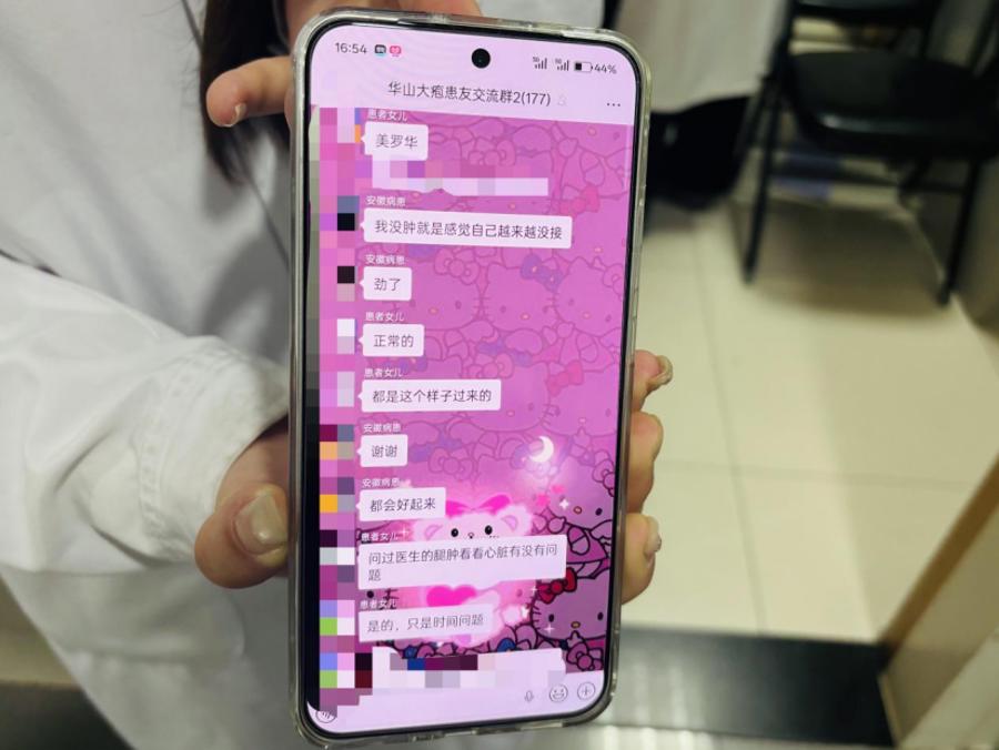 为了方便患者随时咨询,团队还建了一个患者微信群。群里除了发布日常防护提醒、用药指导外,更常见的,是患者之间的互相交流打气。花女士就在群里问过自己的病程感受,一位家属回复她:“正常的,都是这个样子过来的。”她回:“谢谢,都会好起来。”