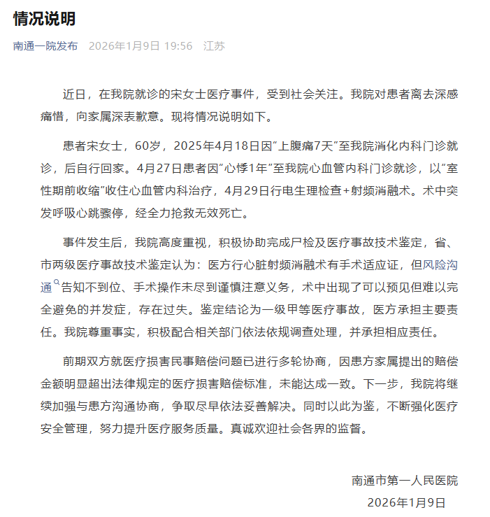 此前据上游新闻报道:2025年4月,江苏省南通市的宋女士因胃病到南通市第一人民医院就诊,本想着做个胃镜检查,却被告知其患有心悸无法进行全麻。几天后,遵照医嘱的宋女士到心血管内科入院治疗,并进行了“心脏电生理检查及射频消融术”。上了手术台后,宋女士就再也没下来。