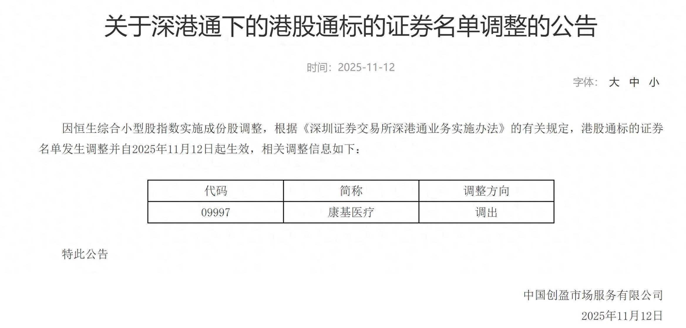 智通财经APP获悉,11月12日,深交所发布公告称,因恒生综合小型股指数实施成份股调整,根据《深圳证券交易所深港通业务实施办法》的有关规定,港股通标的证券名单发生调整,康基医疗(09997)调出港股通名单,自2025年11月12日起生效。