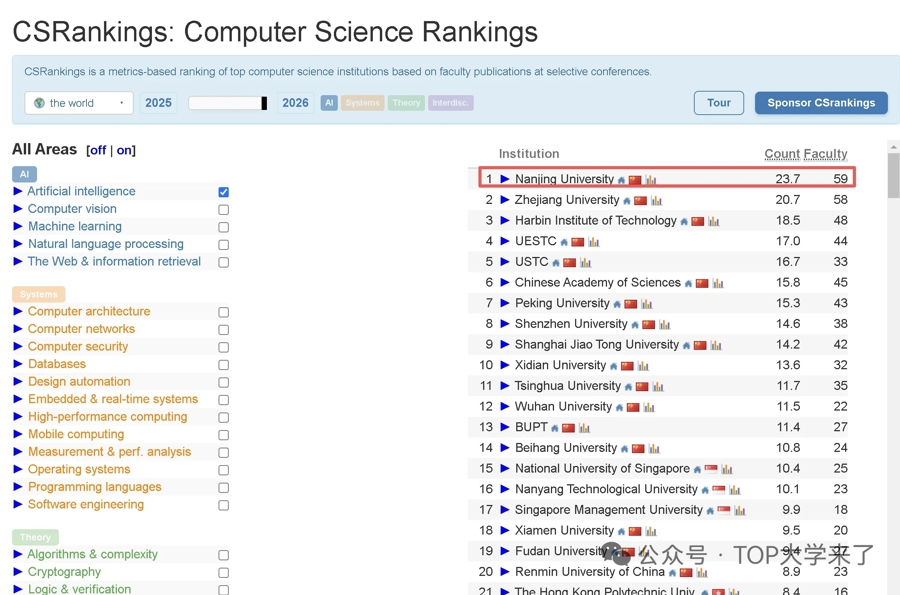 近日,计算机科学领域权威榜单2026 CSRankings正式发布,在人工智能学科的全球排名中,南京大学以23.7的分数位居全球第一,这一成绩不仅刷新了国内高校在该榜单的历史最佳表现,更标志着中国人工智能研究实力正式站上世界之巅。